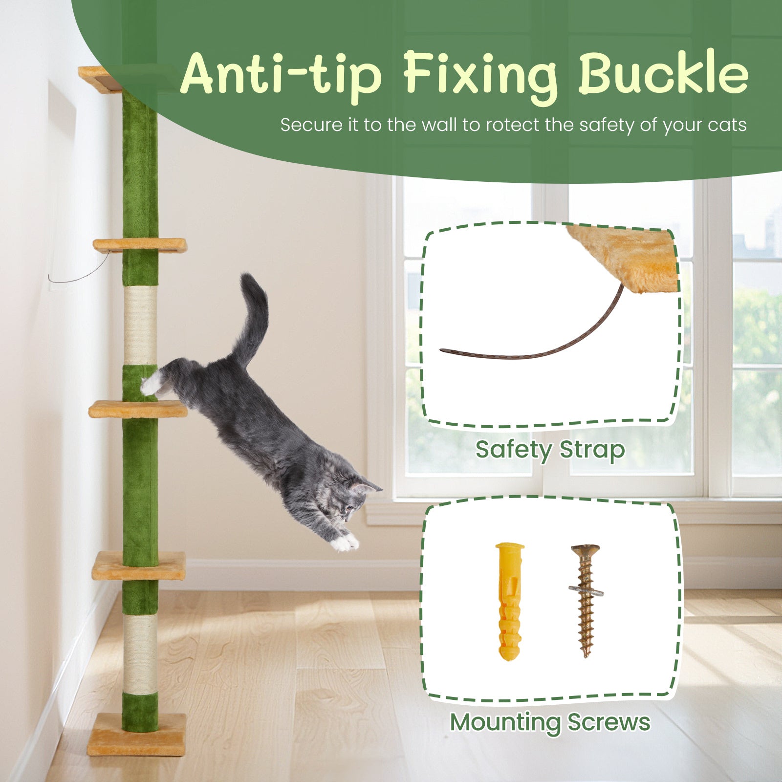 Crafted with durable materials, this cat tower features plush platforms, sisal-wrapped scratching posts, cozy hideaways, and ramps that will keep your cats engaged and satisfied for hours. Whether your cat enjoys climbing to new heights, sharpening their claws, or napping in a cozy corner, the 90-106 Inch Indoor Cat Tree Cat Tower provides everything they need to stay active and entertained.